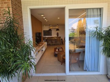 Ampla sala em dois ambientes integrada à varanda gourmet com vista panorâmica do mar
